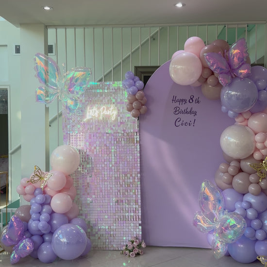 Create a magical, fairy-tale atmosphere for your child’s celebration with our Butterfly Birthday Balloon Backdrop – Pastel Purple Theme.