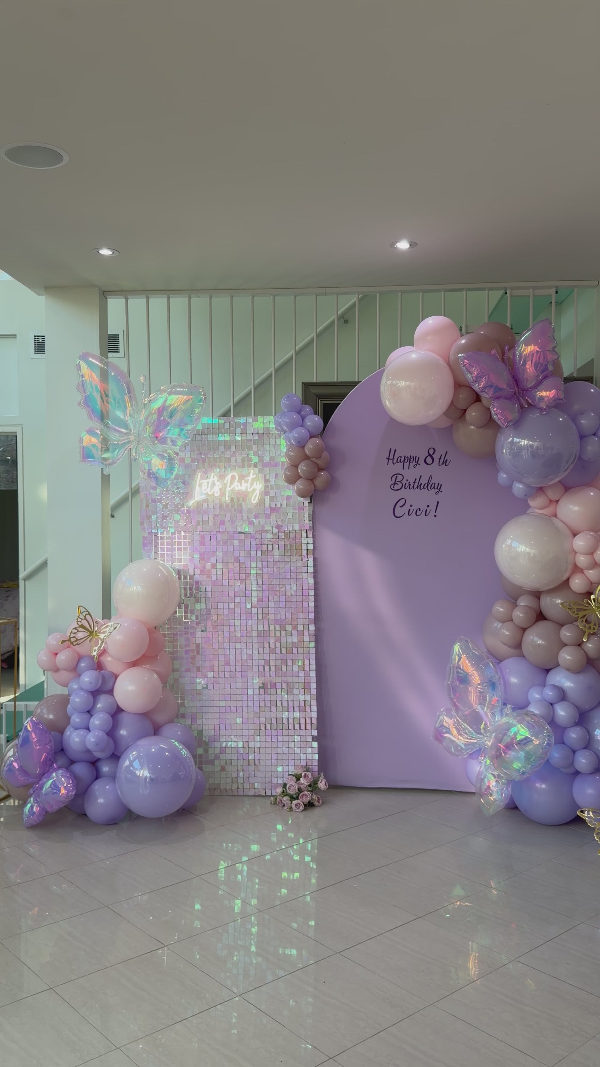Dreamy butterfly-themed birthday balloon backdrop in pastel purple, pink, and lilac tones with sequin wall and custom arch panel. Perfect for girls’ birthday parties and fairy-tale celebrations in Ottawa.