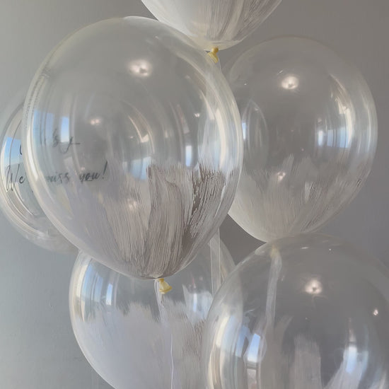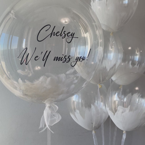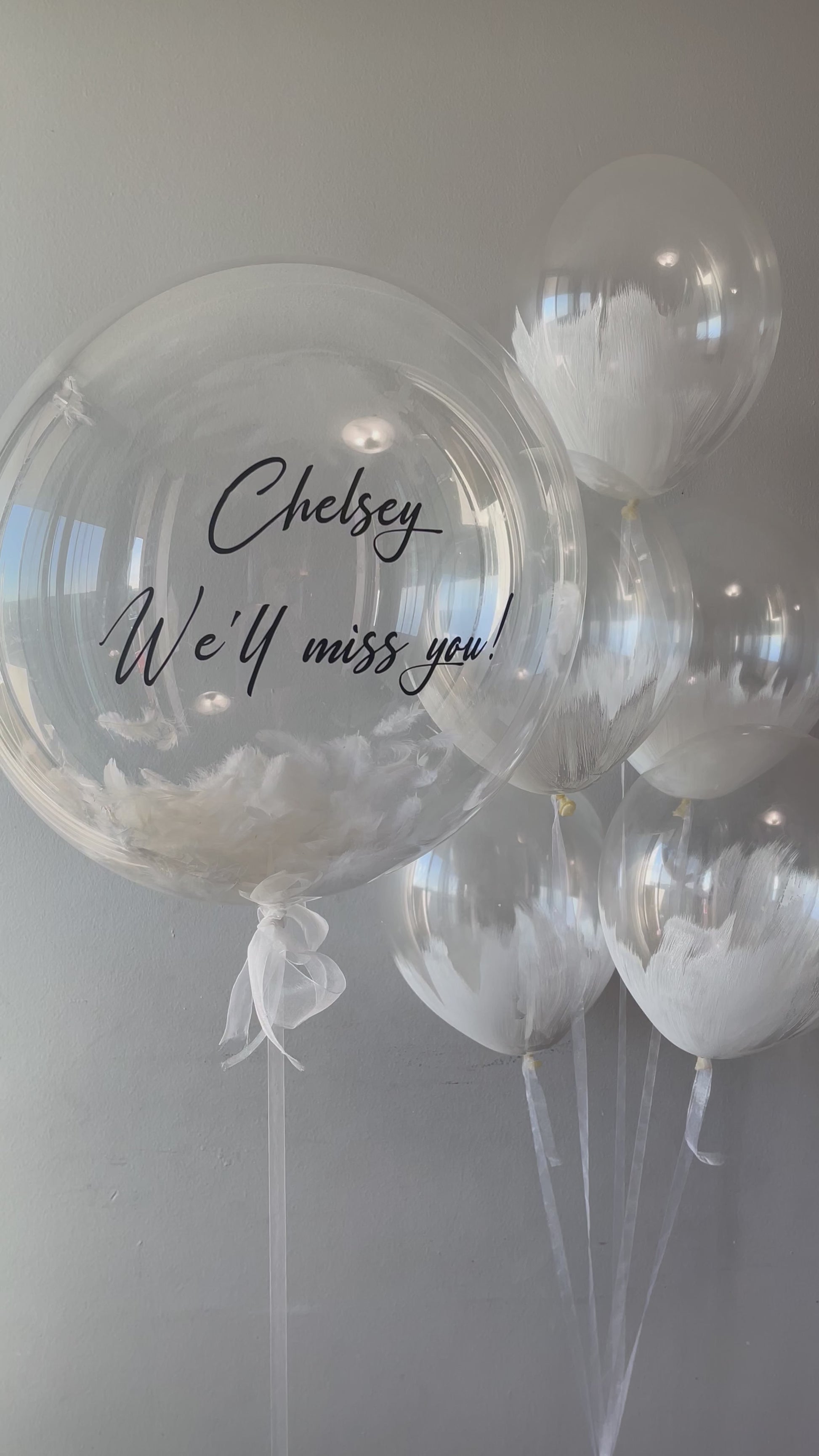 This elegant personalized bubble balloon with soft white feathers is a beautiful way to send love, support, or warm wishes. Perfect for farewell parties, sympathy gifts, celebrations, birthdays, baby showers, or any special moment where you want to include a heartfelt message.