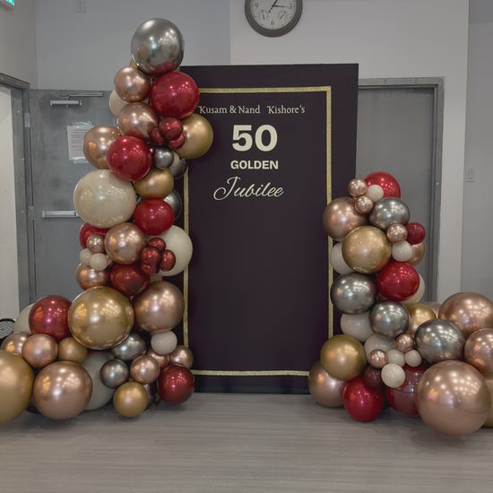 Designed to make a statement, this backdrop is perfect for 50th wedding anniversaries, golden jubilee celebrations, milestone birthdays, and elegant corporate events. The rich color palette and layered balloon styling create a powerful visual impact while maintaining a timeless and sophisticated look.